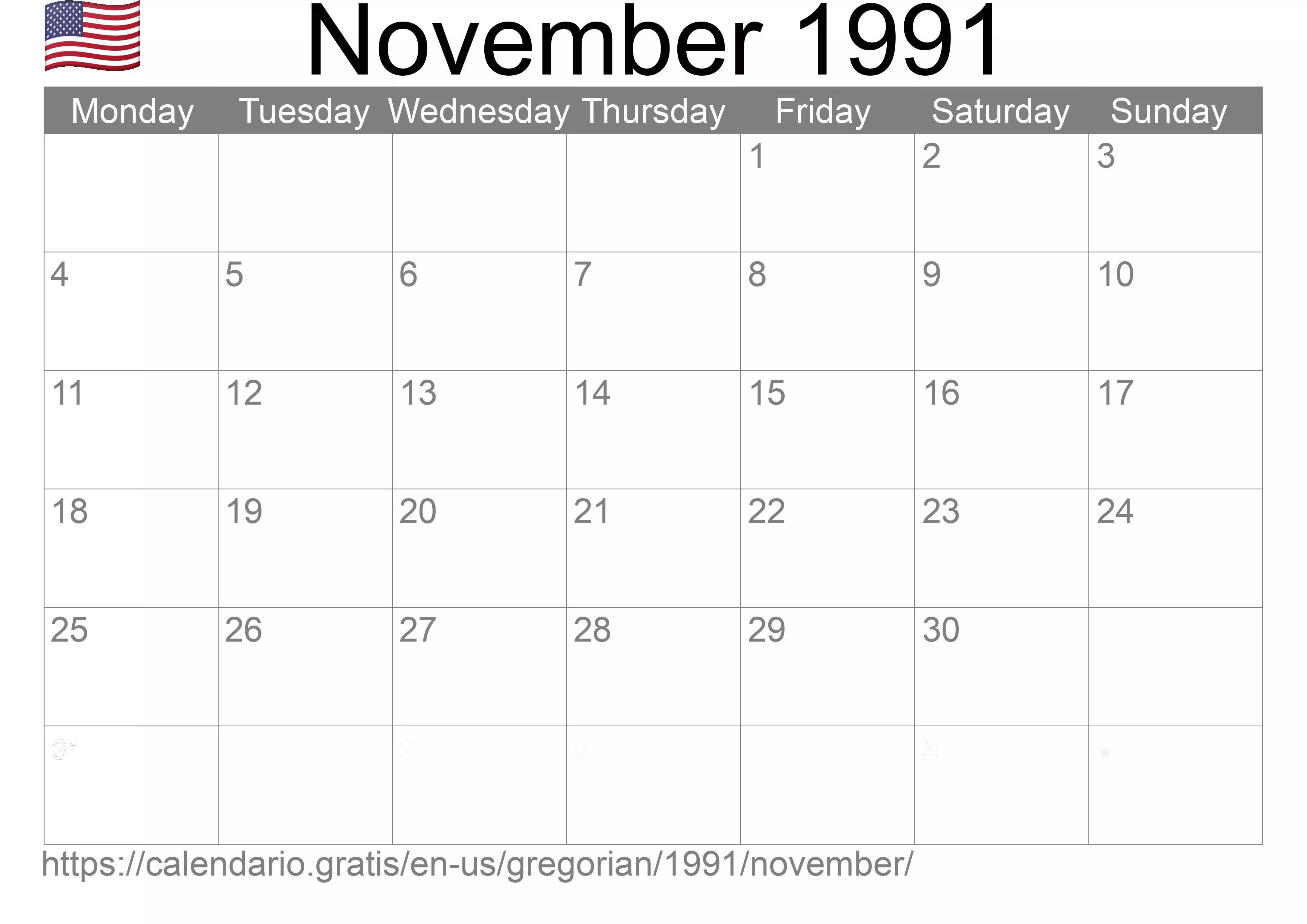 Calendar For November 1991 - Web 6 rows download printable november 1991 calendar. Web thursday, november 7, 1991. Free printable calendar for november 1991. View online or print in pdf format. 21 world philosophy day 21 world pancreatic. You can create online monthly calendar november. Web november 1991 calendar with holidays and celebrations of the united states. Web download october 1991 november 1991 december 1991 november 1991 calendar with week numbers and us federal. State event return day (delaware) international day against violence and.