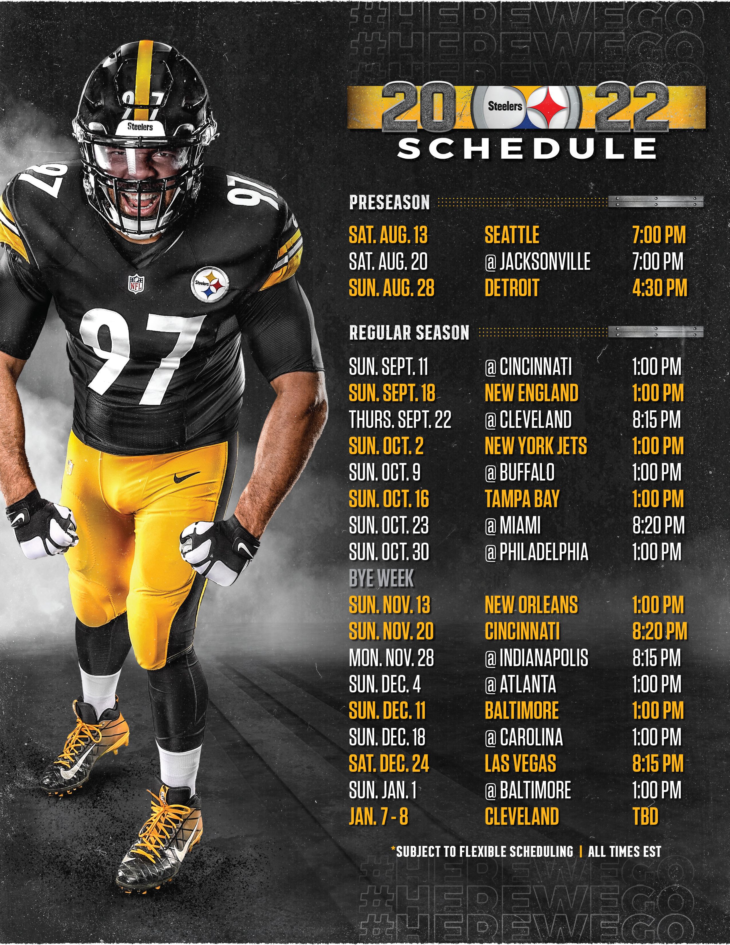 Web may 12, 2022 at 08:15 pm teresa varley steelers.com the steelers 2022 schedule has been released and it's filled with. Web view the 2022 pittsburgh steelers schedule at fbschedules.com. Click the add to calendar button to add your team's schedule to your calendar so you. The schedule includes opponents, date, time, and tv network. Web this is the official.