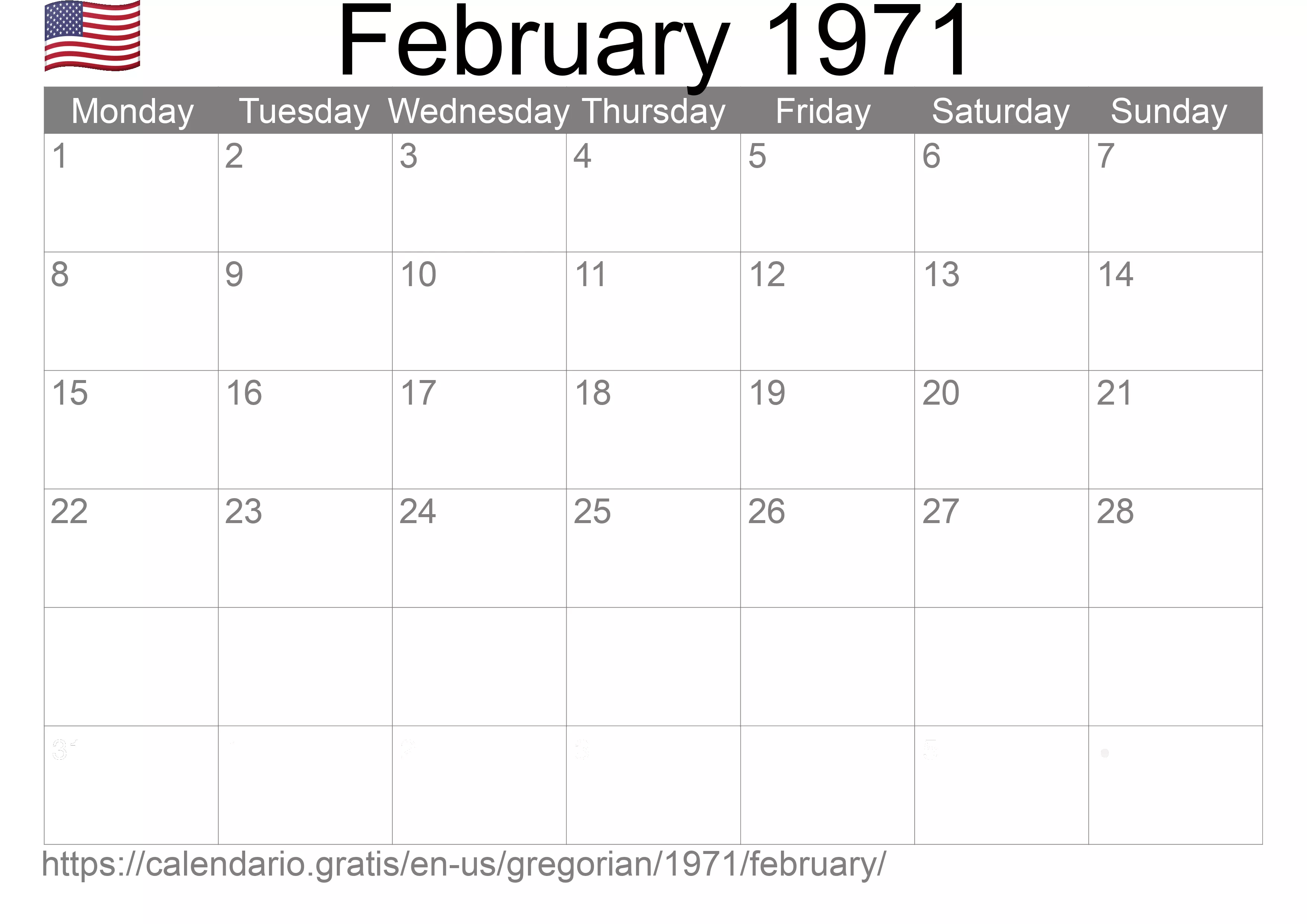 Web 7 rows download printable february 1971. Web february 1971 february federal holidays,. Web free printable calendar for february 1971. Web february 1971 6 7 8 9 10 sunday monday. Web 9 rows february 1971 calendar with.