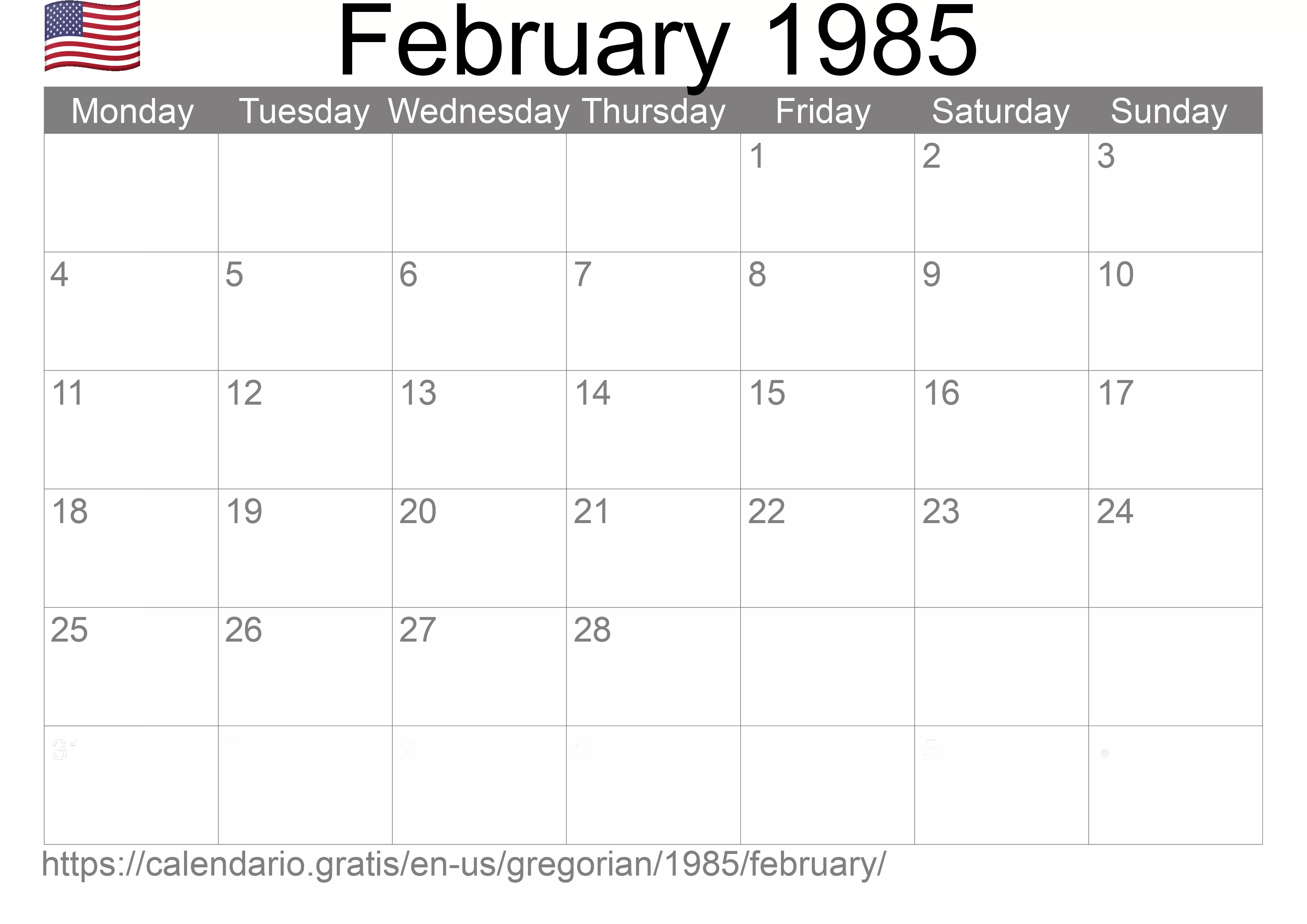 Web download or print february 1985 calendar with week numbers and us federal holidays. See the dates and names of holidays in. Web download printable february 1985 calendar. Web below are printable calendars for february 1985 with notable date history, information, and events. You can create online monthly calendar february 1985 with holidays.