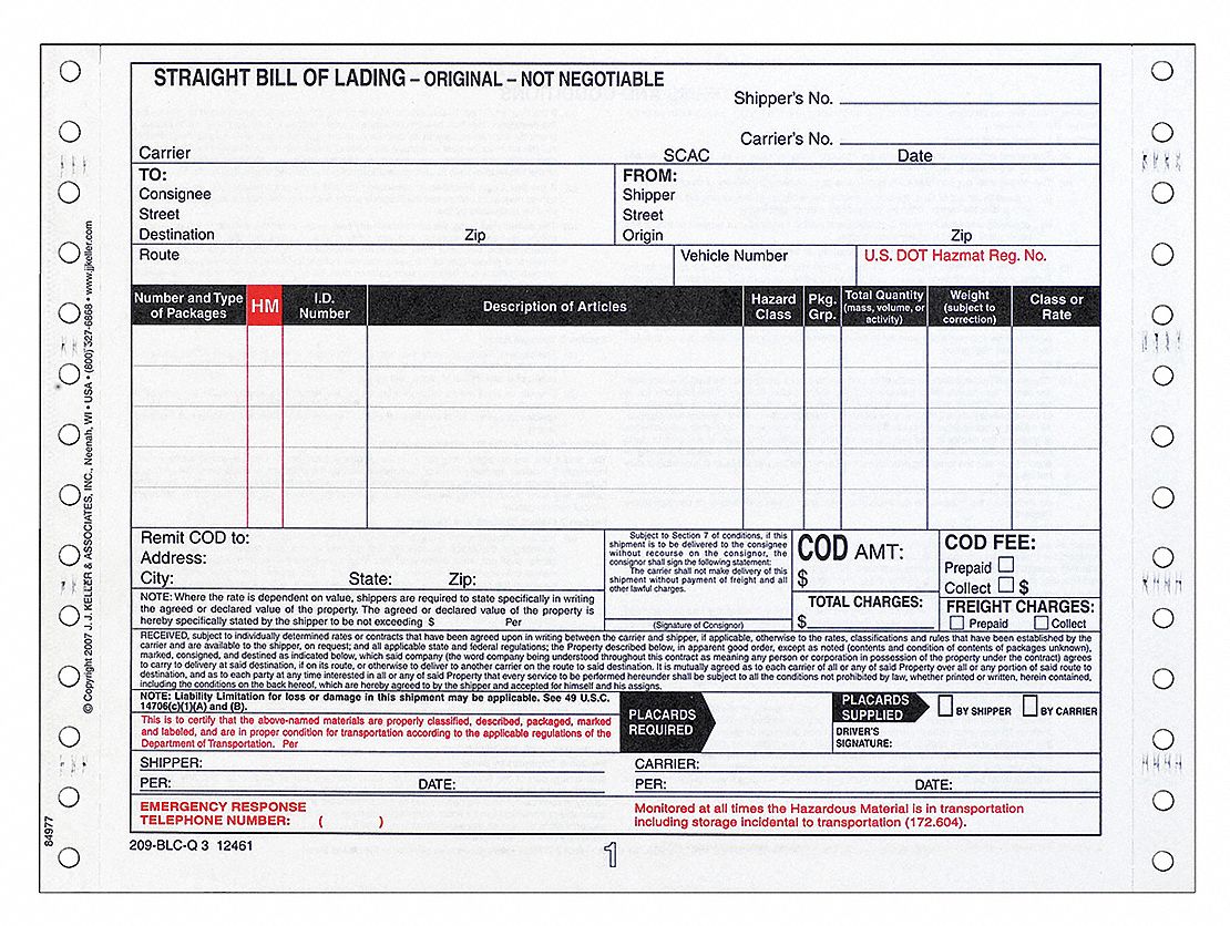 JJ KELLER Bill of Lading Forms Paper/Form, Chemical Safety, Hazmat