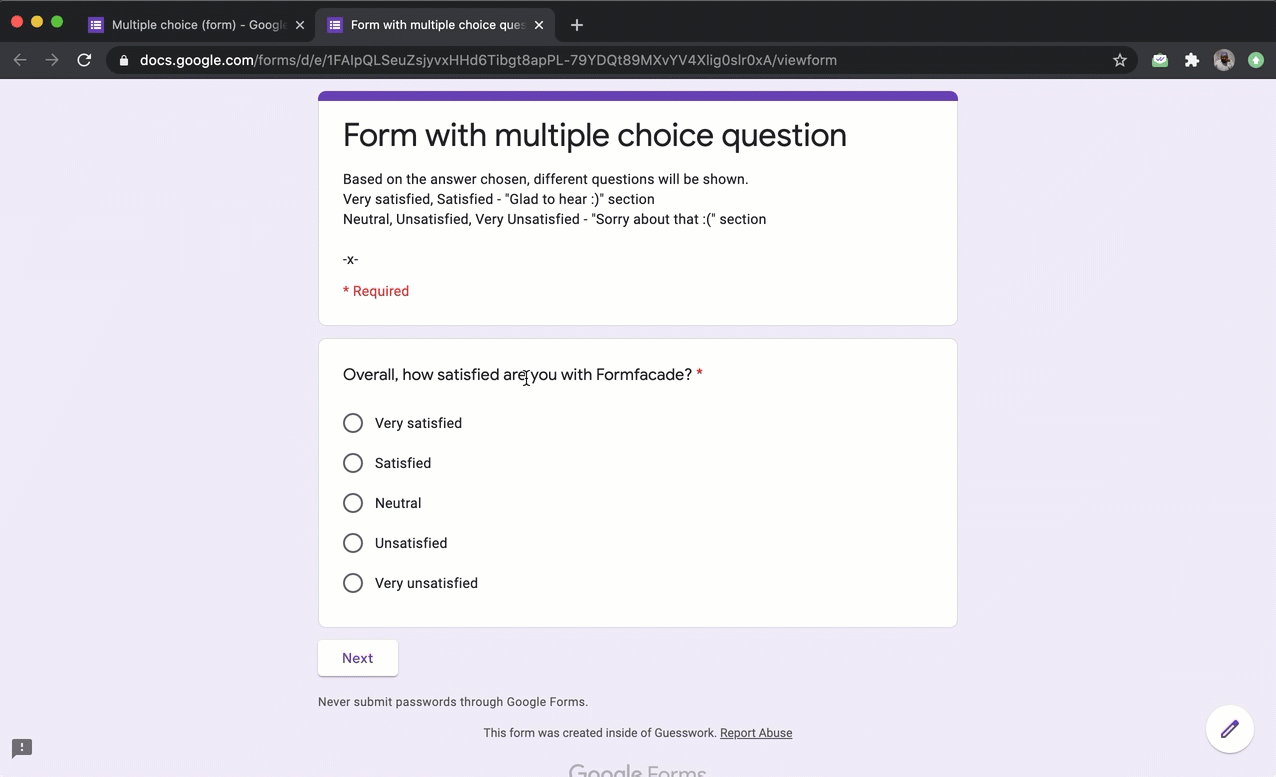 Formfacade How to show different questions based on answers in Google