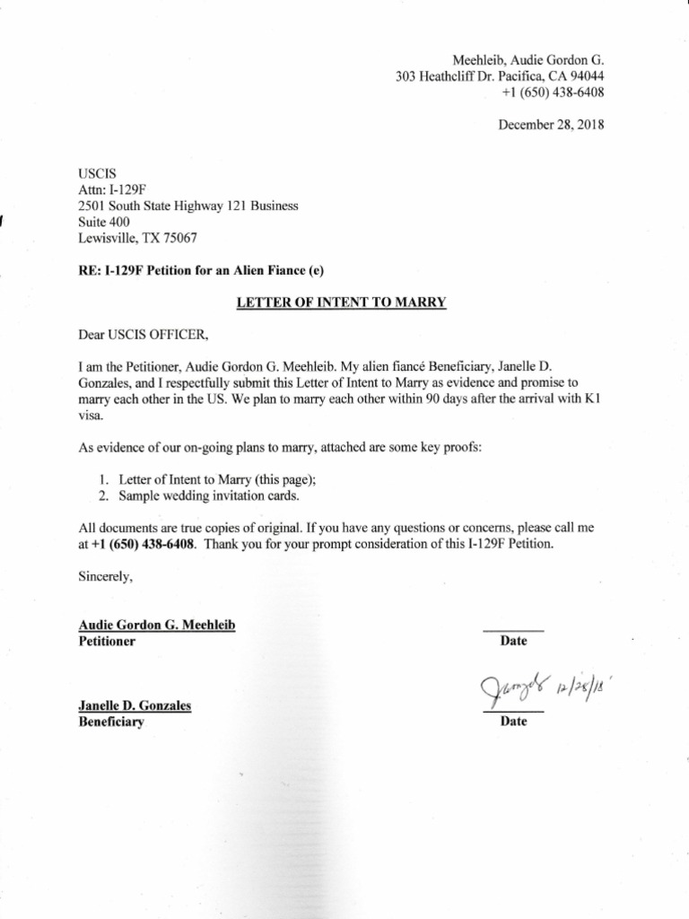 I129F Evidence of Intent to Marry your fiance for the K1 visa Letter