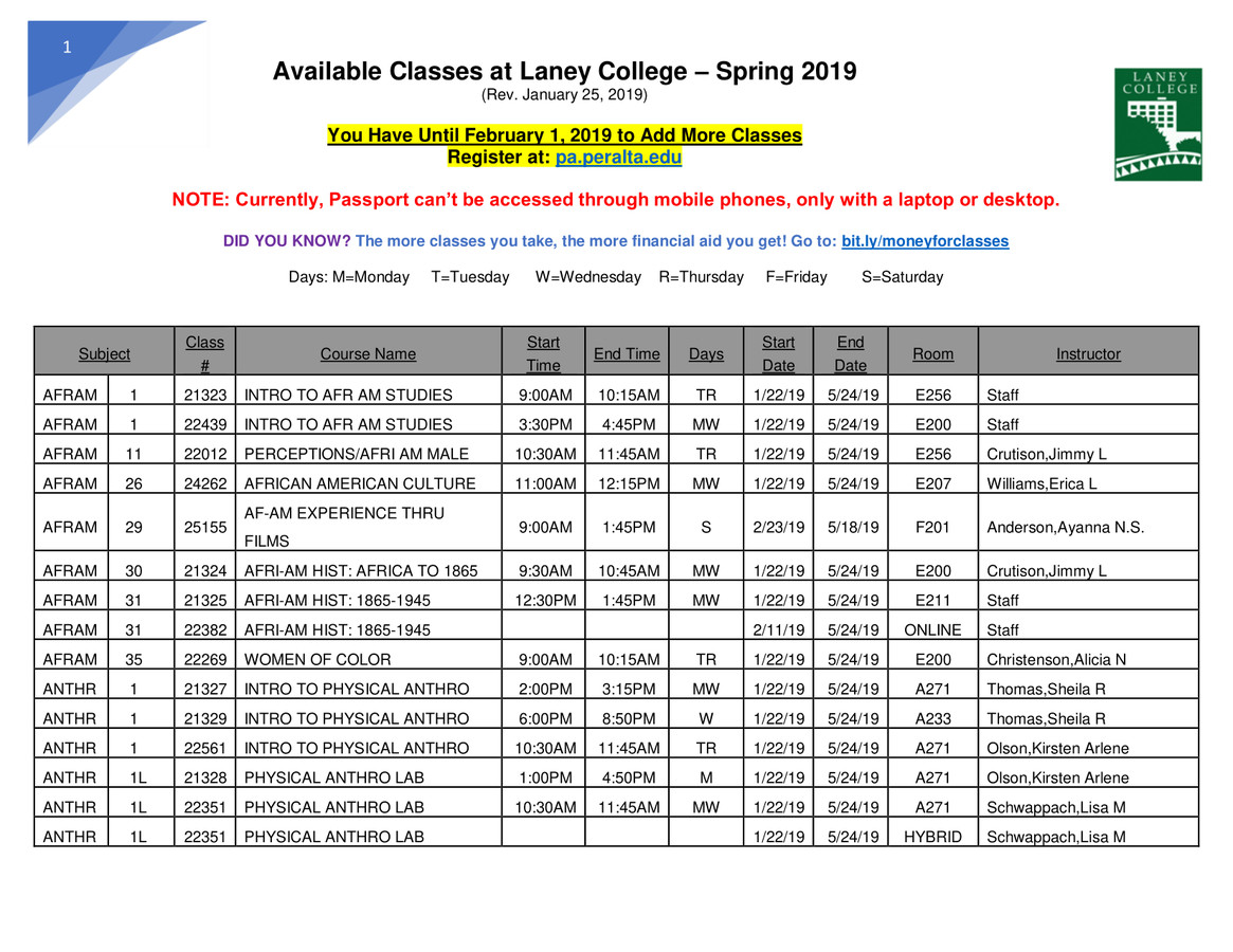 Class Schedules Laney College Laney College
