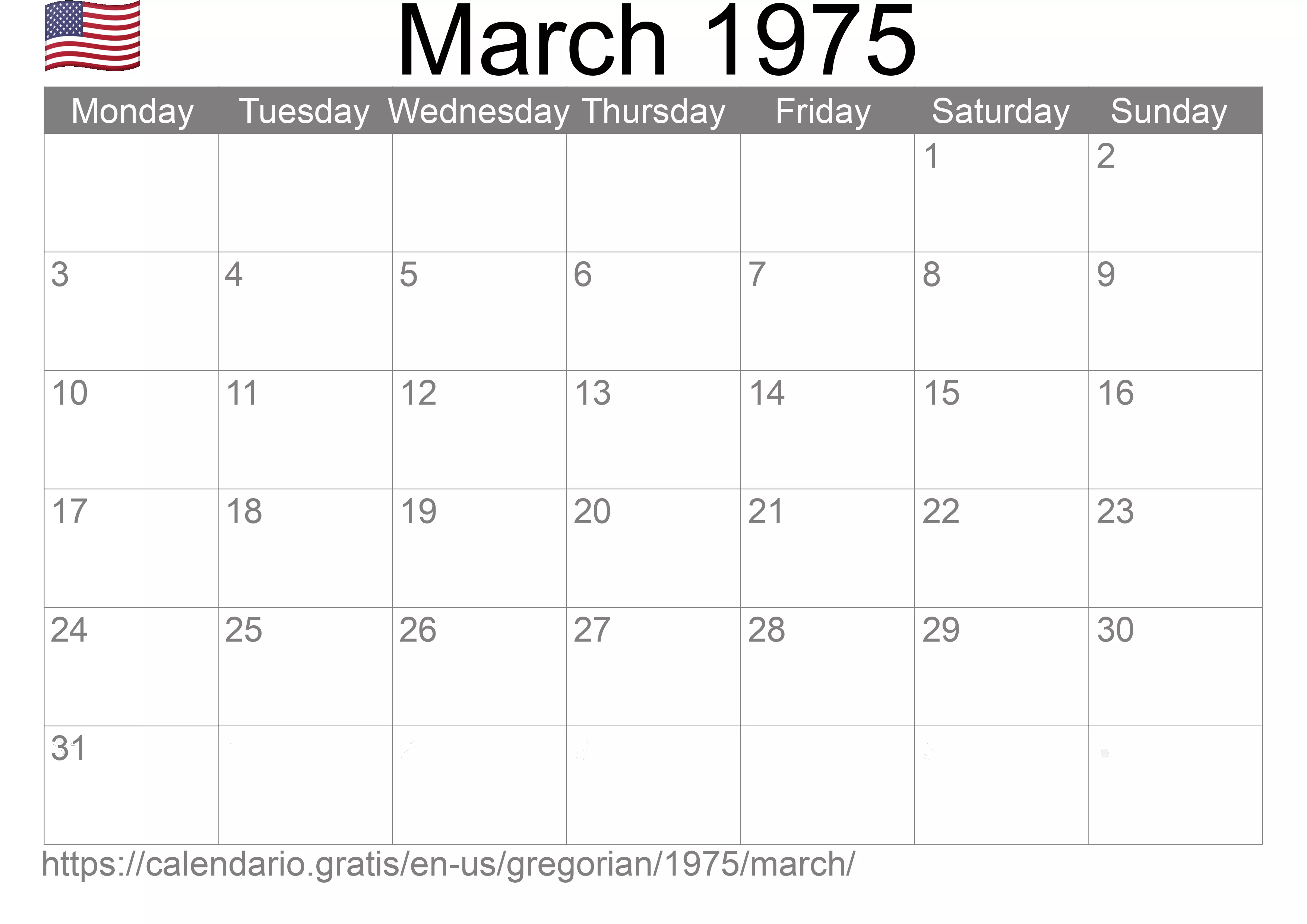 Calendar March 1975 from United States of America in English ☑️