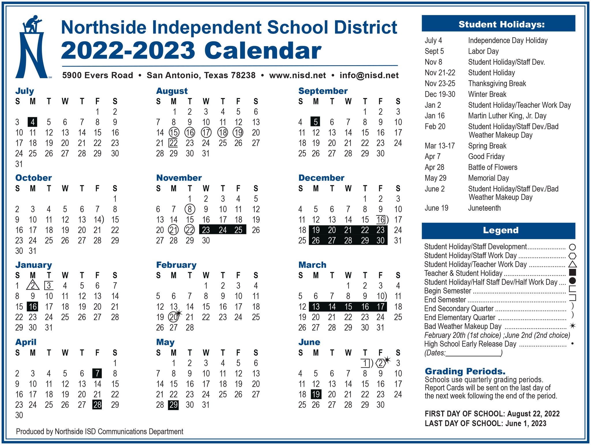 ![NISD School Calendar with Holidays 20222023 [Northside ISD]](https://usschoolcalendar.org/wordpress/wp-content/uploads/2022/12/NISD-School-Calendar-with-Holidays-2022-2023-Northside-ISD-3-2048x1447.png)