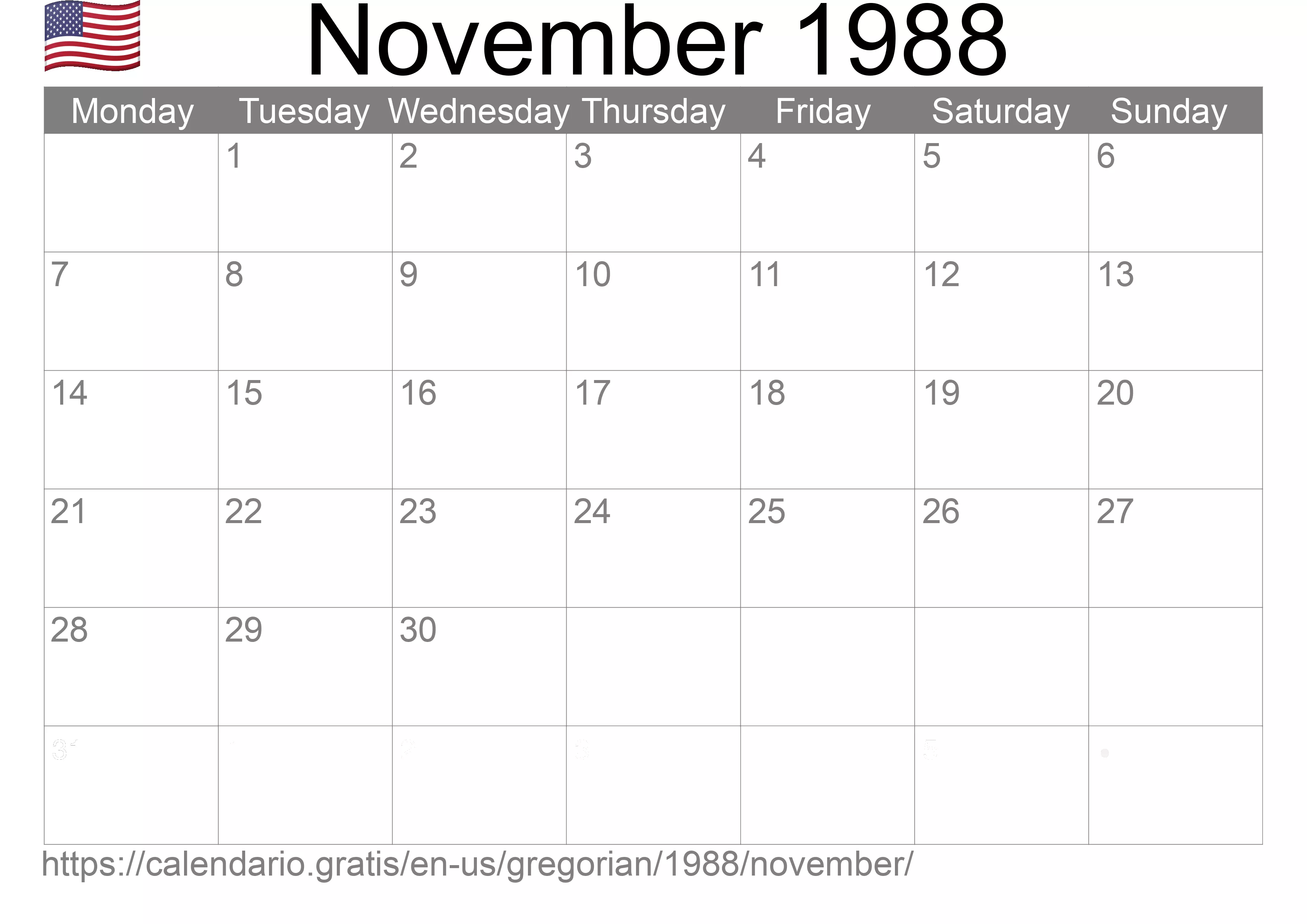 Calendar November 1988 from United States of America in English ☑️