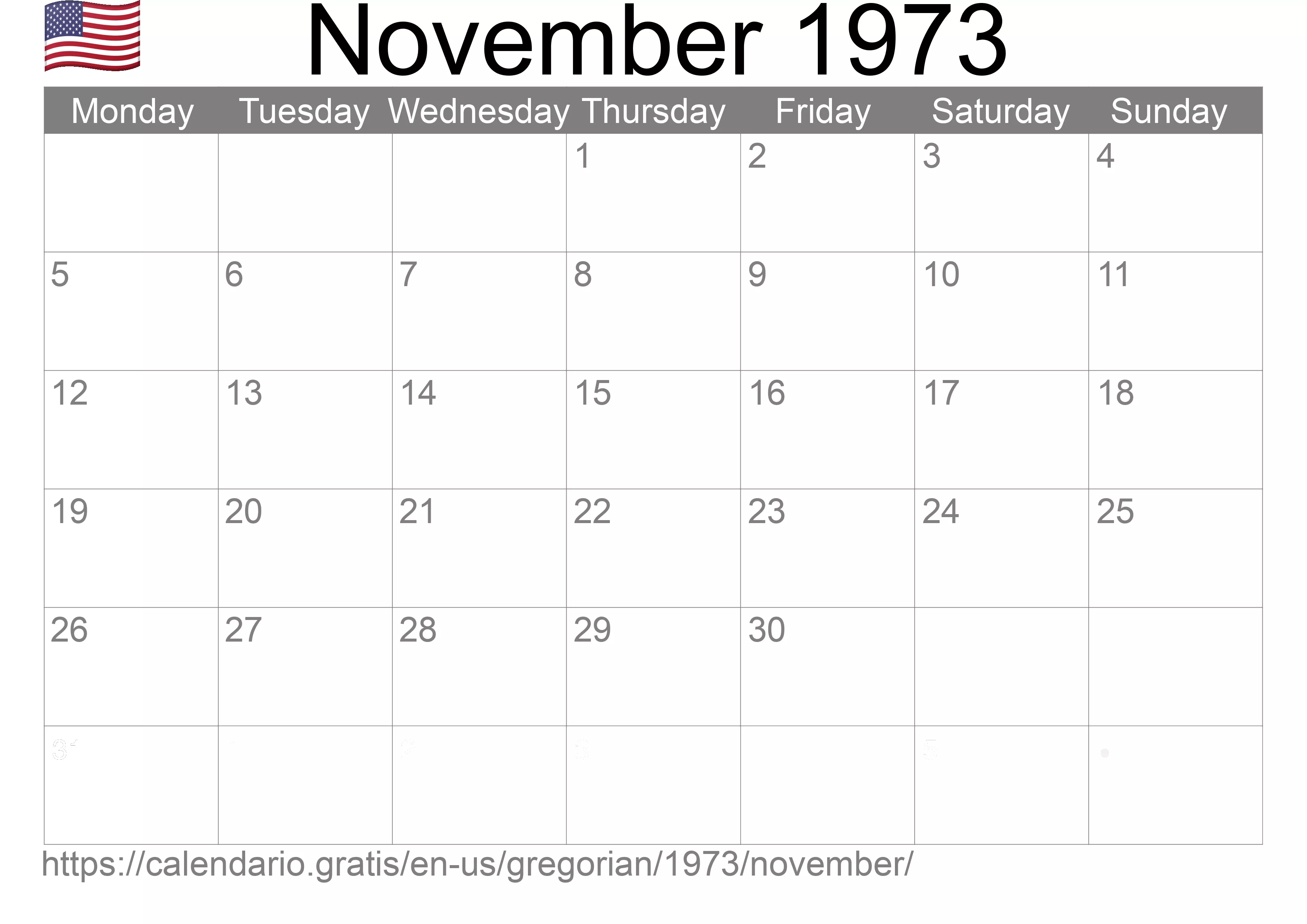 November 1973 Calendar - Web download printable november 1973 calendar. View online or print in pdf format. Web download a blank november 1973 calendar with sunday start in word, excel or pdf format. Free printable calendar for november 1973. You can create online monthly calendar november 1973 with holidays. Learn how to add notes, events,.