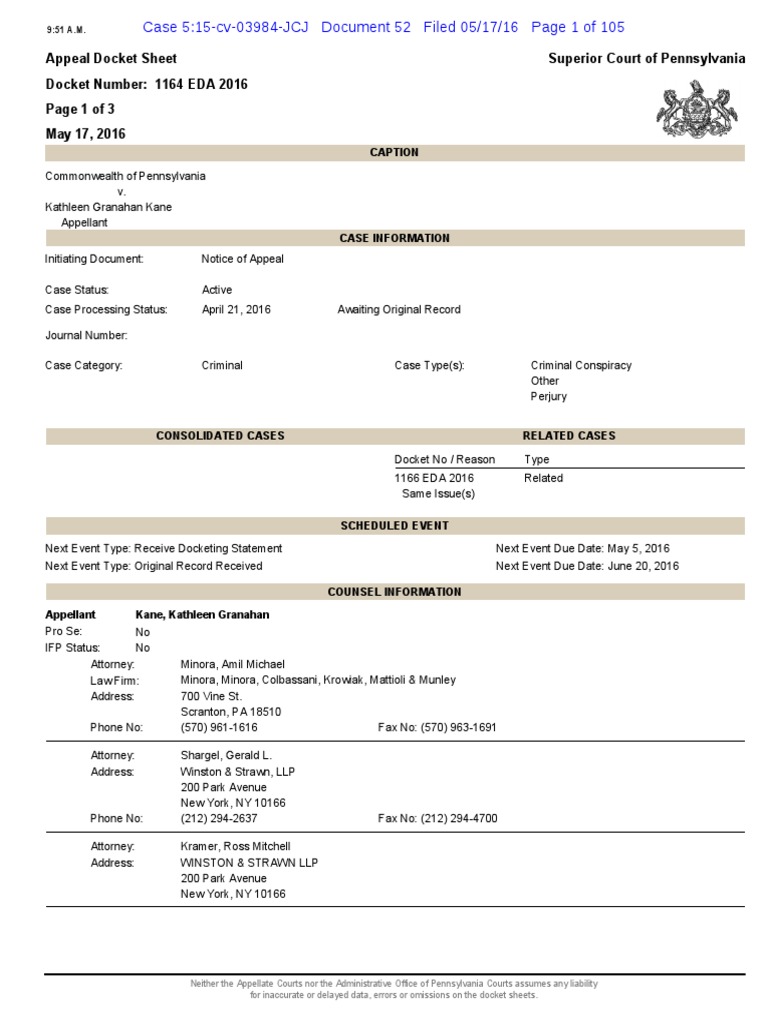 Superior Court Case No. 2016 1164 EDA Kathleen Kane Appeal DOCKET Sheet