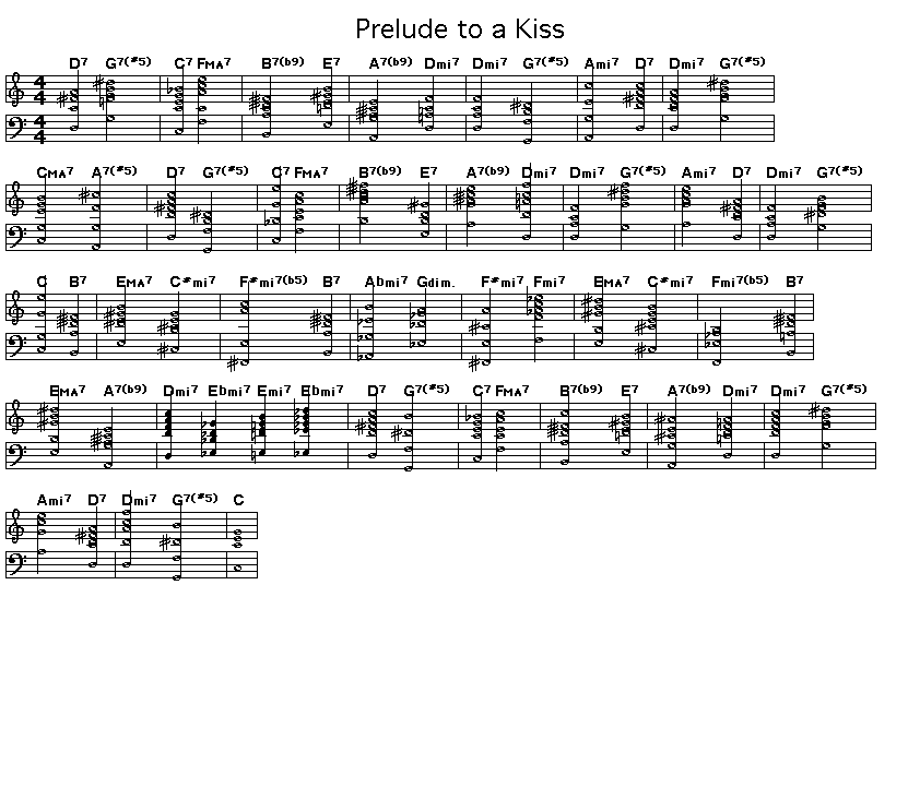 C6 b7 9 emaj7 c m7 f m7 5 b7 g m7 g 7 f m7 f7 5 emaj7c m7 f m7 5 b7 emaj7 a7 9 dm7e m7 em7 e 7 d7 g7 5 c7. Contains printable sheet music plus an interactive, downloadable digital sheet music file. Leadsheets typically only contain the lyrics, chord. Download and print in pdf or midi free sheet music for prelude to a kiss by duke ellington arranged by ericfontainejazz for piano (solo)